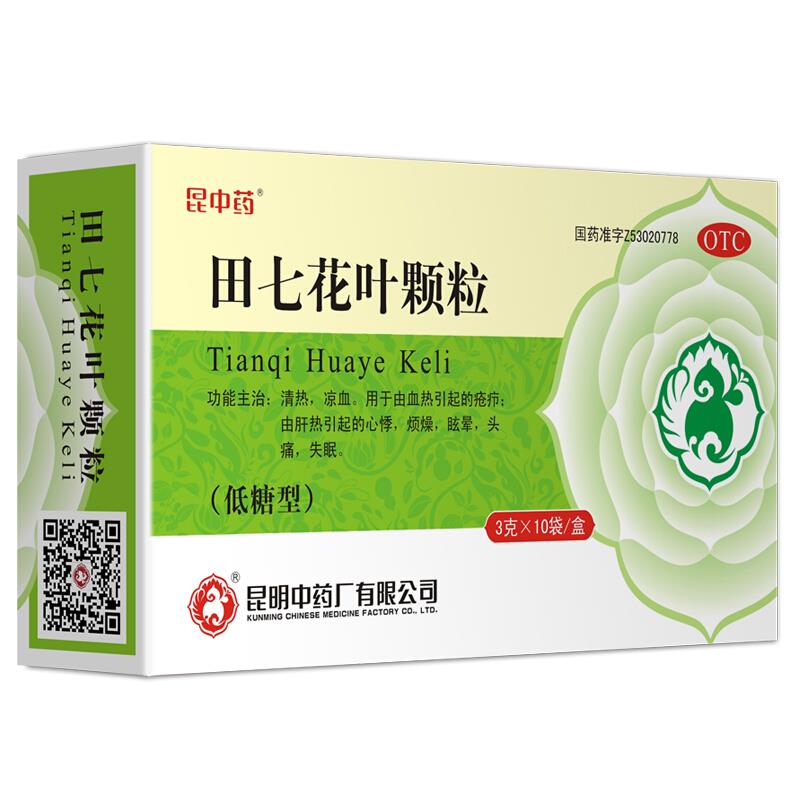 【品名】田七花叶颗粒【成份】三七叶茎、三七花。辅料为蔗糖。【性状】本品为黄色或棕黄色的颗粒;气微香,味苦甜。【功能主治】清热,凉血。用于由血热引起的疮疖;由肝热引起的心悸,烦燥,眩晕,头痛,失眠。【规格】每袋装3克【用法用量】开水冲服,一次1袋(3克),一日3~5次。【不良反应】尚不明确。【禁忌】孕妇禁用。【注意事项】忌烟、酒及辛辣食物。其它事项详见说明书。【药物相互作用】详见说明书。【贮藏】密封。【包装】复合膜,10袋/盒。