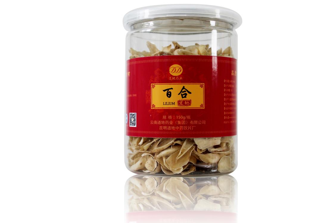 【品名】百合【产地】四川【性味与归经】甘,寒。归心,肺经。【功能与主治】养阴润肺,清心安神。用于阴虚燥咳,劳嗽咳血,虚烦惊悸,失眠多梦,精神恍惚。【规格】150克/瓶【用法与用量】6~12克。【贮藏】置通风干燥处。【生产批号】见瓶底【生产日期】见瓶底【有效期至】见瓶底【执行标准】中国药典2015年版一部【药品生产许可证编号】滇20160179【生产企业】早明道地中药饮片厂【生产地址】云南省昆明市五华区普吉路521号