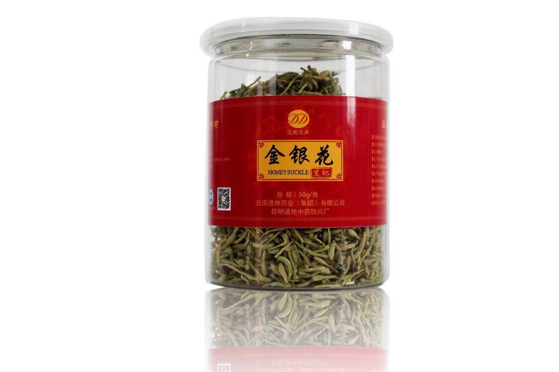 【品名】金银花【产地】山东【性味与归经】甘,寒。归肺、心、胃经。【功能与主治】清热解毒,疏散风热。用于臃肿疔疮,喉痹,丹毒,热毒血痢,风热感冒,温病发热。【规格】50克/瓶【用法与用量】6~15克。【贮藏】置阴凉工燥处,防潮,防蛀。【生产批号】见瓶底【生产日期】见瓶底【有效期至】见瓶底【执行标准】中国药典2015年版一部【药品生产许可证编号】滇20160179【生产企业】早明道地中药饮片厂【生产地址】云南省昆明市五华区普吉路521号